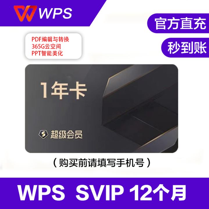 【自动直冲】WPS超级会员『12个月』直冲丨立即到账